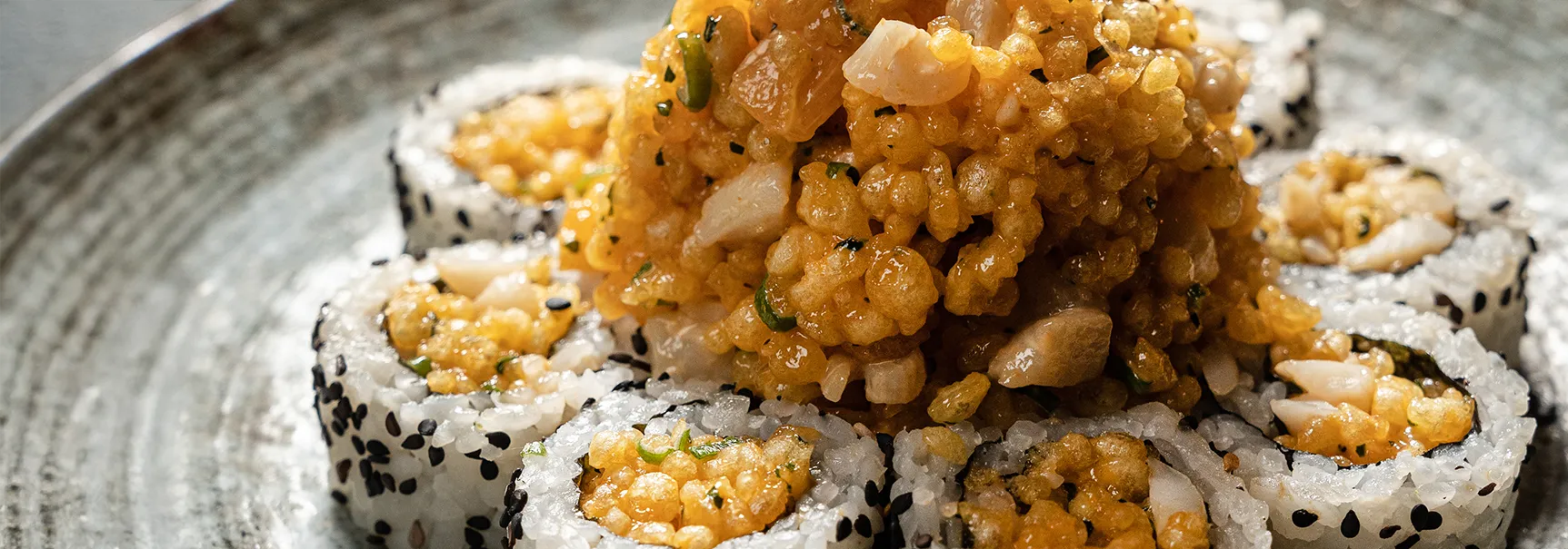 Cangrejo spicy, masago, aguacate, espárrago tempura, cebollín, anguila, foie gras, ajonjolí.