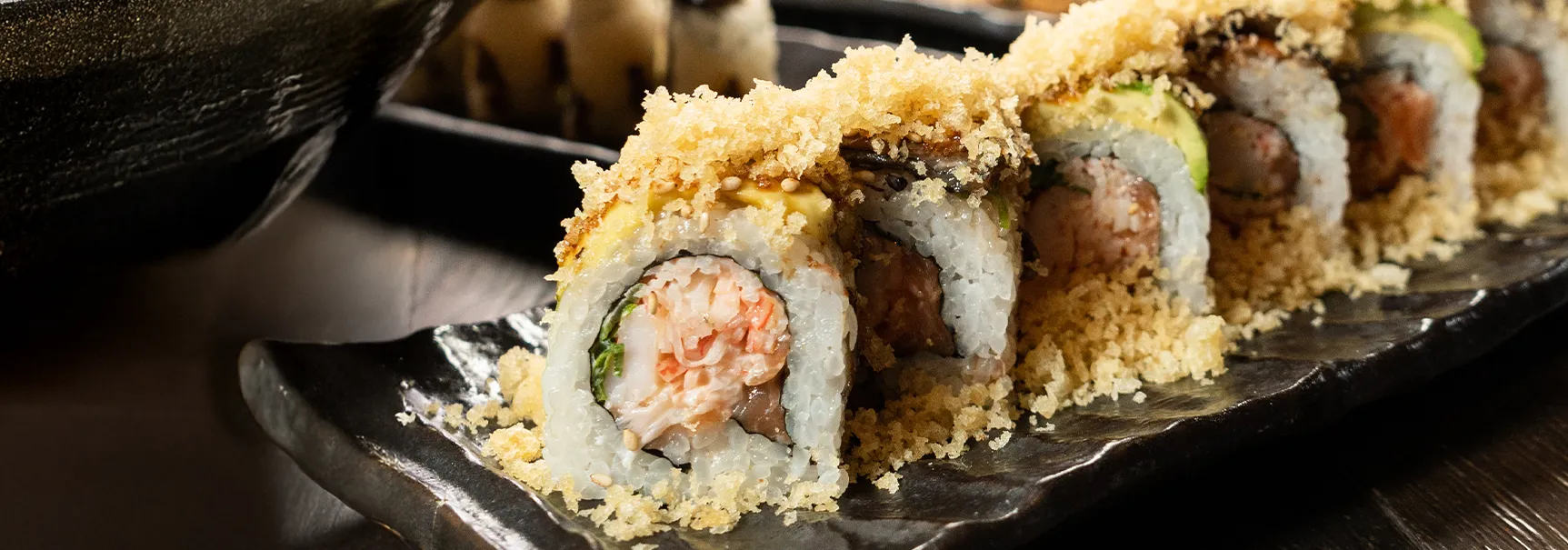 Camarón empanizado, pasta kanikama, queso crema, aguacate por dentro. Furikake, tártara por fuera.